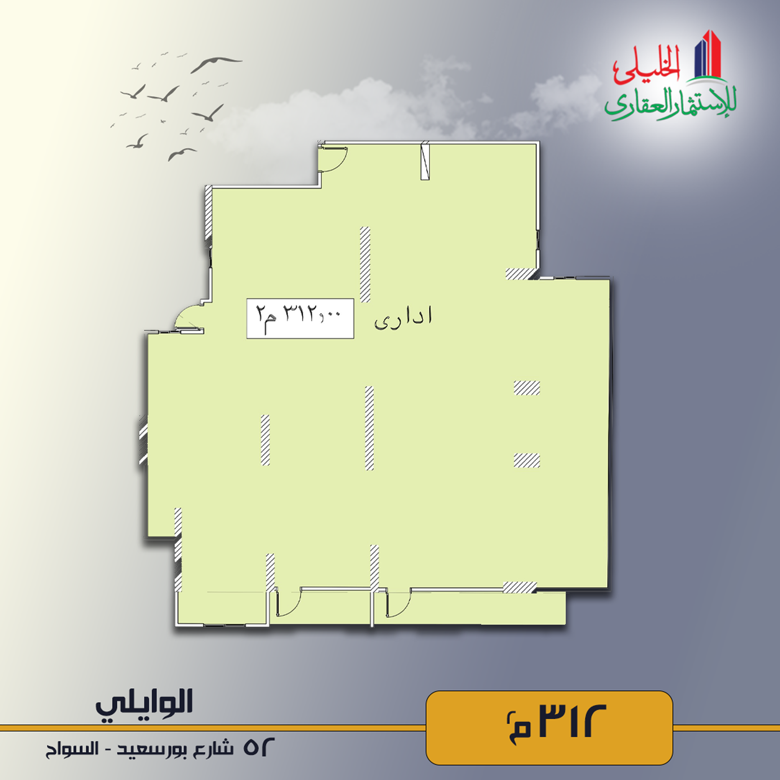 “Its area is 312 m² on the first floor overlooking Port Said Street next to Bank Masr .”